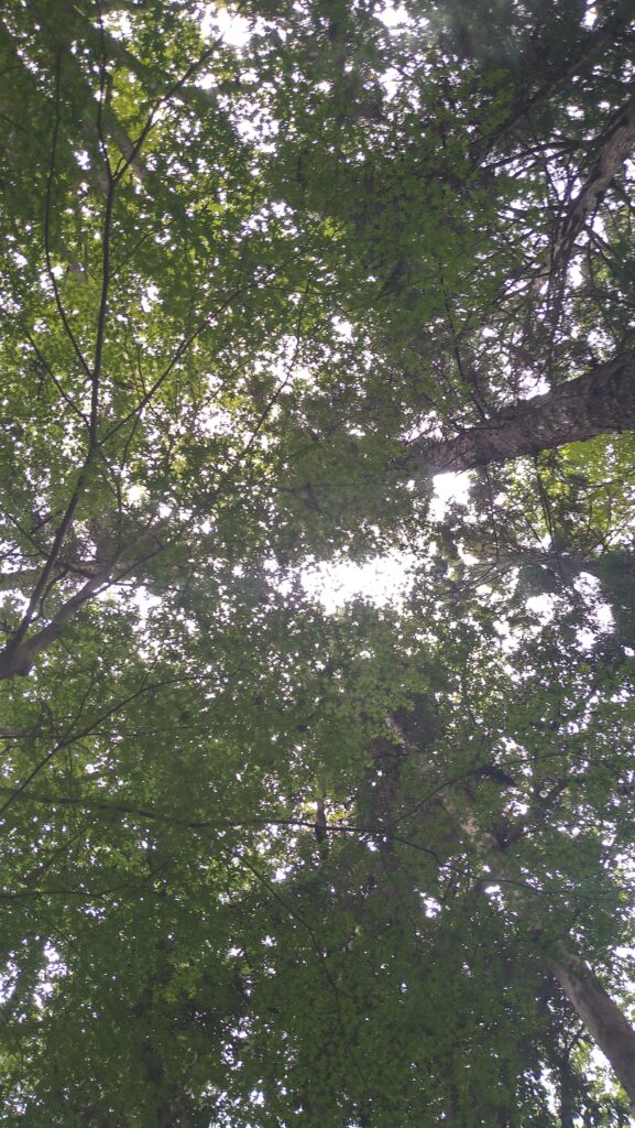 ちょうどよい場所にあるベンチから寝そべり、見上げるとこんな感じ。撮影時は9月でしたので今時期はそろそろ葉っぱも色づくころでは。