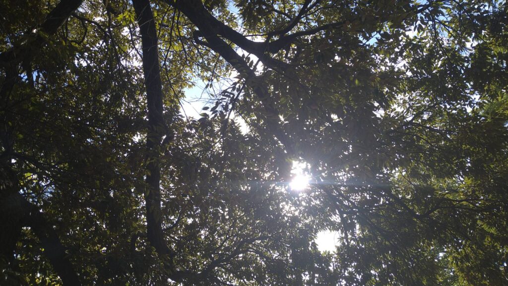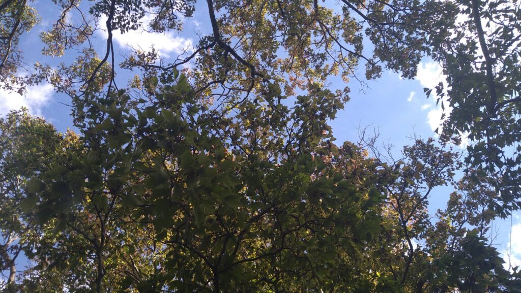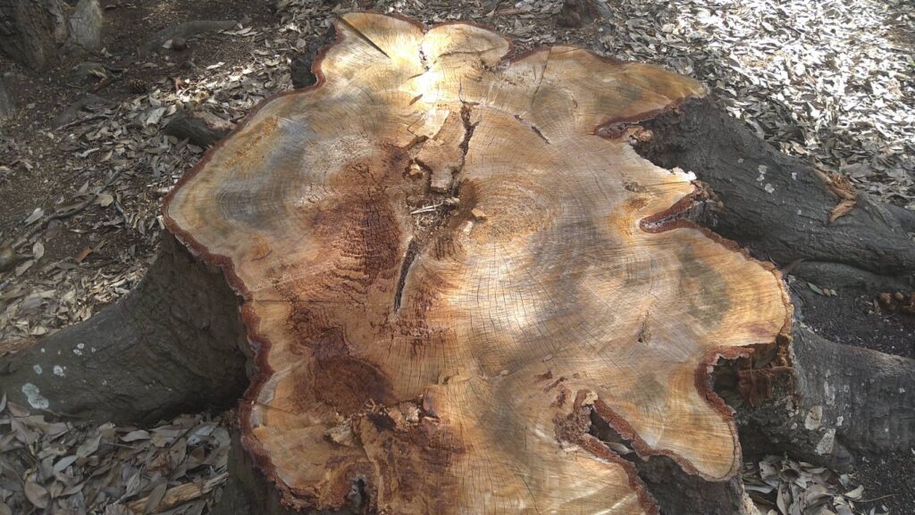 切り株好きにとってたまらないこの断面及び輪郭、木の色味も絶妙な味わいをみせてくれています。さっそく切り株に腰かけて見えた景色がこちら。こちらのこかげはほどよく空も見えて明るい雰囲気です。
