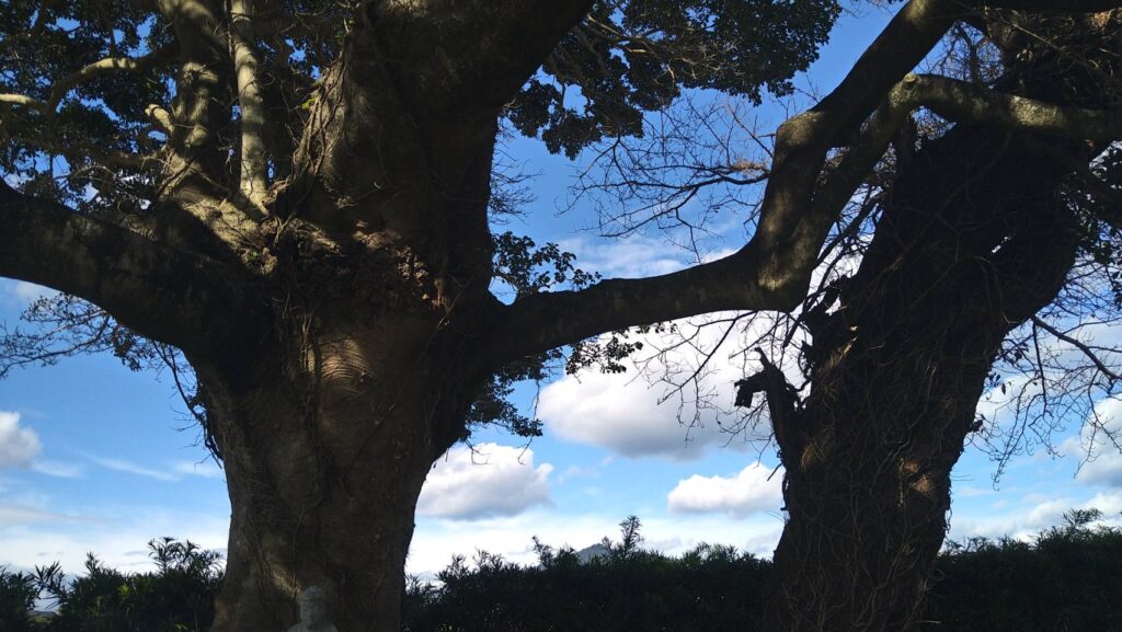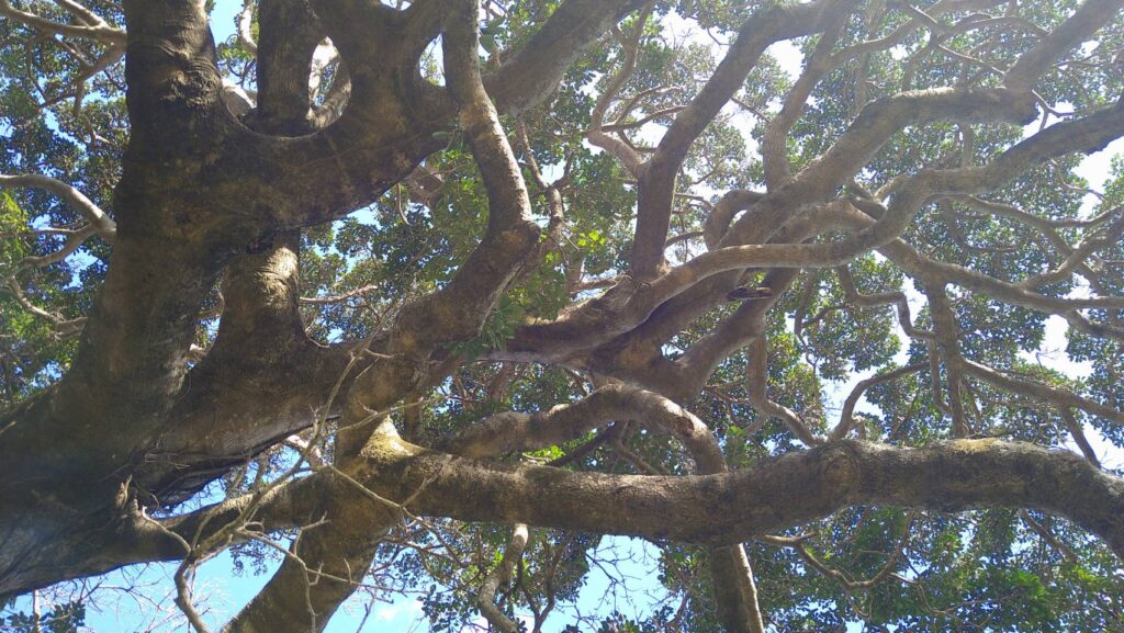 そこから見上げた木陰はこんな感じ。巨木ならではの枝の太さに曲がり具合でなんだかうにょうにょ生きているみたい………。